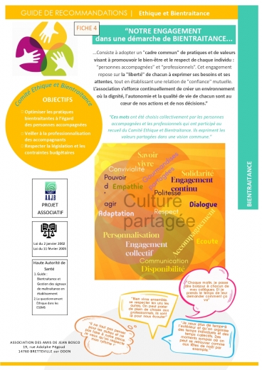 Vous trouverez ci-dessous les différents documents du Guide de recommandations "ETHIQUE et BIENTRAITANCE" qui a été élaboré par le Comité Ethique et Bientraitance créé au sein de l'Association des Amis de Jean Bosco en Janvier 2021.